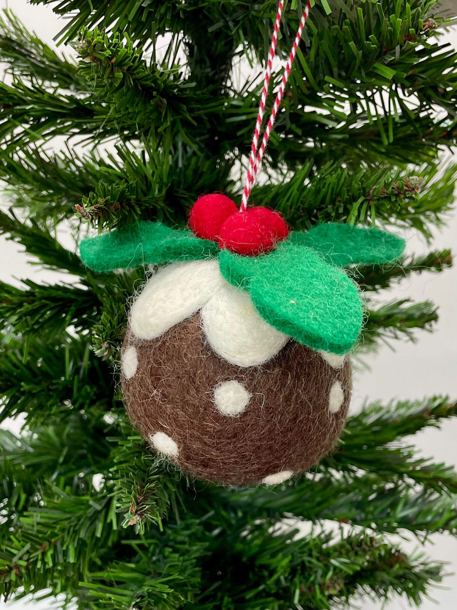 This hand-crafted felt Christmas pudding bauble captures festive tradition with its detailed wool felt design, topped with holly berries and cream. Measuring 6.5 x 6.5 x 7.5 cm, it features a red and white hanging thread for easy display on your tree. Ethically made by a World Fair Trade Organisation approved supplier, it supports sustainable practices that prioritize both people and the planet without compromising quality. A charming, conscientious addition to your holiday décor. Please note, this is not a toy.