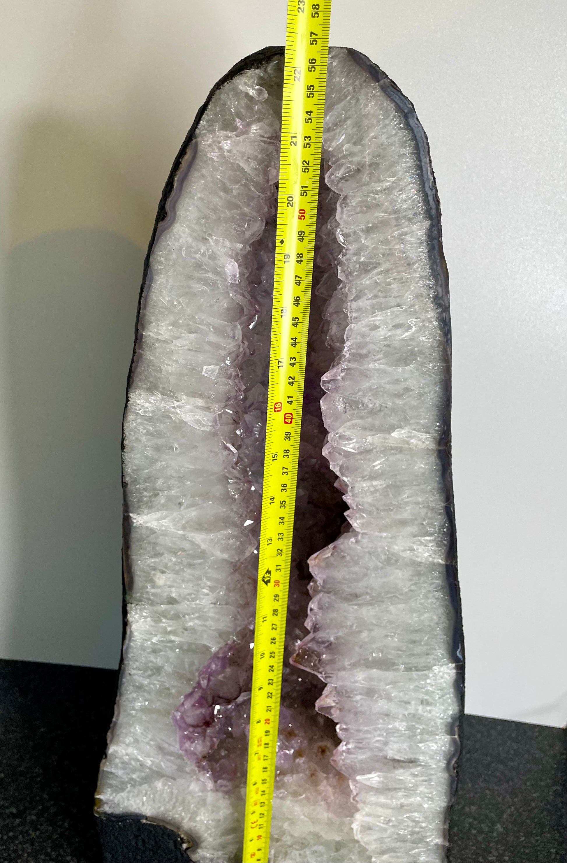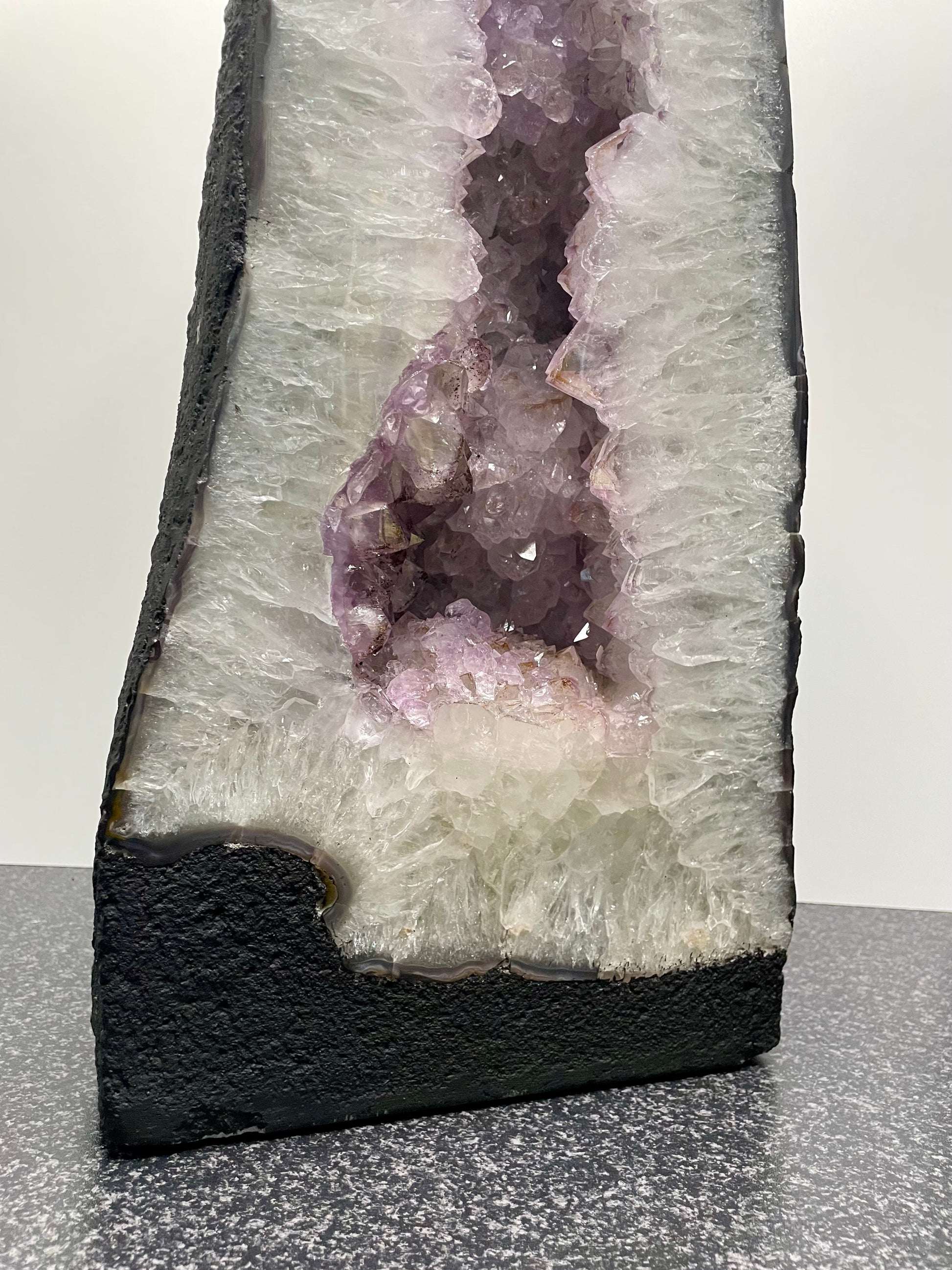 This imposing snowy amethyst church geode measures 57cm in height and weighs 35.2kg, featuring a majestic cluster of deep purple amethyst crystals set against a backdrop of white quartz. Its substantial size and weight make it ideal for collectors seeking a statement piece, while its crystalline structure supports a calming and balancing environment. Expertly sourced, this geode exemplifies natural beauty and offers enhanced energetic properties suitable for both decorative and spiritual use.
